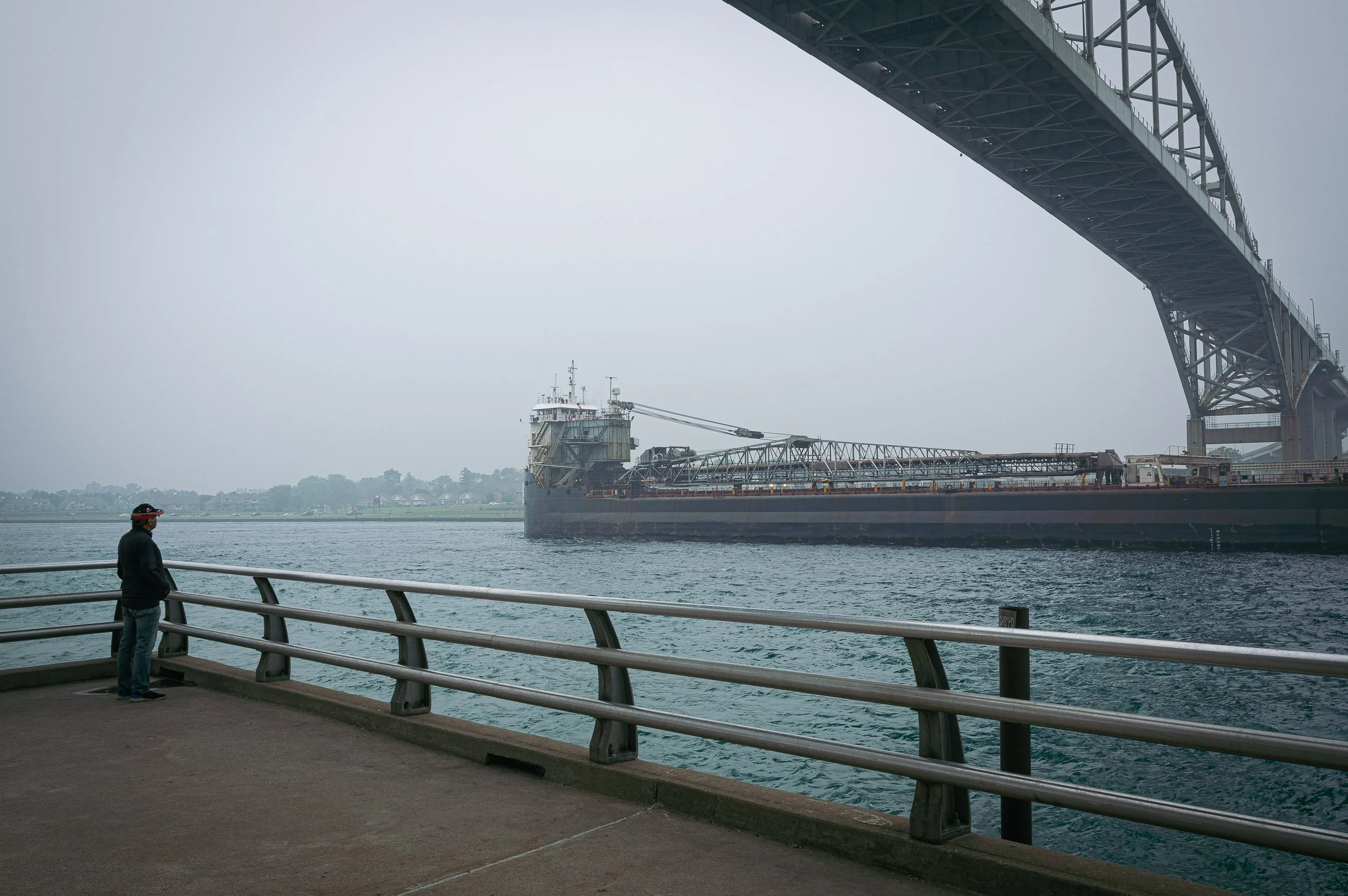 I managed to get some free time one afternoon while I was in Sarnia Ontario and decided to head down to the water and work on some long exposure photographs under the Bluewater Bridge. As luck would have it the air had a beautiful misty haze that day and I was able to also make some photographs of the bridge itself in its hazy glory. As I was working on compositions I notice a large ship coming out of the fog on the lake and work its way towards the river channel. There was a very mysterious feel in the air and the silent and subtle movement of the ship through the fog had a “ghost ship” quality to it. It was worth stopping to watch. I grabbed my spare camera from my bag and started making a few photographs of the scene. I guess I wasn’t the only one captivated by the moment. It was a scene that demanded you stop and soak it up, as this gentleman was doing also. I don’t usually add people to my photographs but all lines converged to this moment and the photograph was already made for me. A documentary photograph of power, peace, and contemplation.